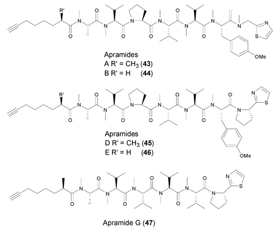All the terminal alkynyl-containing linear peptides were solely discovered from marine cyanobacteria. In 2000, Luesch et al. reported the isolation and identification of six new linear peptides, apramides A–G (Figure 6), from the marine cyanobacterium Lyngbya majuscule collected at Apra Harbor, Guam [43]. Apramides A (43), D (45) and G (46) are Moya-containing acylic peptides, while apramides C and F consist of 2-methyl-7-octenoic acid moiety (Moea) in their structures. Apramides B (44) and E (47) possess a 7-octynoicacid unit (Oya) in lieu of the Moya moiety, and the rest of the structures are identical to apramides A and D, respectively. Apramides A–G was inactive in cytotoxic, antibacterial, antifungal assays, but apramide A exhibited stimulating elastase activity.