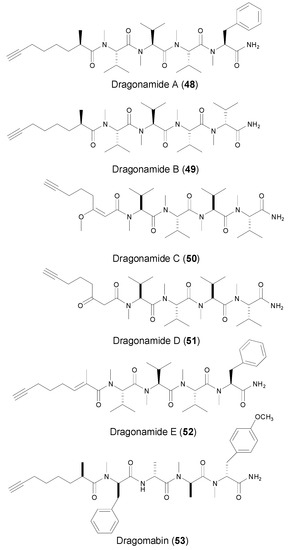 Dragonamides are a family of structurally close linear peptides composing of a variety of terminal alkynyl units (Figure 7). Several separate Panamanian collections of Lyngbya majuscule Gomont afforded dragonamides A, B (48–49) and E [44,45,46], while the collection of brown Lyngbya polychroa from Hollywood Beach, Fort Lauderdale, FL led to the discovery of dragonamides C and D [47]. Dragonamides A and B contain a terminal 2-methyl-7-octynoic acid unit (Moya), whereas dragonamides C, D and E (50–52) possess three different terminal acetylene units, 3-methoxy-2-en-7-octynoic acid (k), 3-keto-7-octynoic (l) (E)-2-methyloct-2-en-7-ynoic acid (m), respectively, which were not previously reported from marine peptides. Dragonamides did not exhibit strong activities against a variety of tumor cell lines, except dragonamides A and E which showed moderate in vitroactivity against leishmaniasis. Along with dragonamides A and B, another terminal Moya-containing linear peptide, dragomabin (53, Figure 7), was isolated and identified in 2007, from a Panamanian strain of the marine cyanobacterium Lyngbya majuscula [45]. Dragomabin possesses the best differential toxicity between parasite and mammalian cells, with IC50 value of 6.0 μM against the W2 chloroquine-resistant malaria strain and IC50 value of 182.3 μM against Vero cells (kidney epithelial cells).