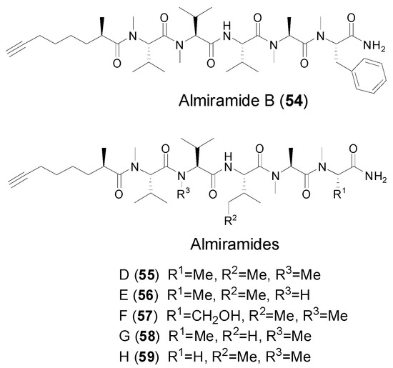 In 2010, Linington et al. reported the isolation and identification of a series of terminal fatty acyl units-containing linear peptides, almiramides A–C, from a Panamanian strain of the marine cyanobacterium Lyngbya majuscule [14]. Among them, almiramide B (54) is featured with a terminal Moya unit (Figure 8), whereas almiramide C contains a reduced form of Moya as a 2-methyloct-7-enoic acid residue. Biological evaluation of these three compounds showed that almiramides B and C possessed good selectivity between parasite and mammalian cells with strong in vitro antiparasitic activity against leishmania (IC50 = 2.4 and 1.9 μM, respectively), and weak activity against Vero cells (IC50 = 52.3 and 33.1 μM, respectively). Just recently, a series of new terminal Moya-containing linear peptides, almiramides D–H (55–59) along with known almiramide B (Figure 8), were isolated and identified from a cyanobacterium sample of Oscillatoria nigroviridis collected at the Colombian Caribbean Sea [48]. Intriguingly, two structurally representative almiramides B and D showed mild toxicity against five human tumor cell lines, but high toxicity against the gingival fibroblast cell line was used as reference to evaluate selectivity against tumor cell lines compared with primary cell line.