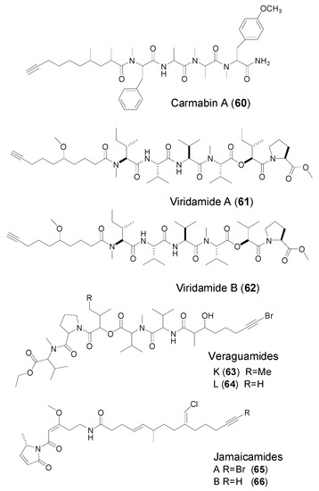 It is interesting to note that many linear peptides have also been found to possess the terminal alkynyl fatty acyl moieties, including 2,4-dimethyl-9-decynoic acid (g), 2-methyl-7-octynoic acid (Moya, h), 7-octynoic acid unit (Oya, i), 5-methoxydec-9-ynoic acid (Mdyna, j), 3-methoxy-2-en-7-octynoic acid (MeO-Oya-2-ene, k), 3-keto-7-octynoic acid (l), and (E)-2-methyloct-2-en-7-ynoic acid (m), which are different from that of cyclic peptides, except for Hmoya and Br-Hmoya residues present in both linear and cyclic veraguamides (Table 1). In addition, an acyclic amide-like secondary metabolite from the marine cyanobacteria Lyngbya majuscula, termed jamaiapcamides A, has provided an alkynyl bromide, vinyl chloride, β-methoxyeneone moiety (n) to the terminal alkynyl-containing peptides.