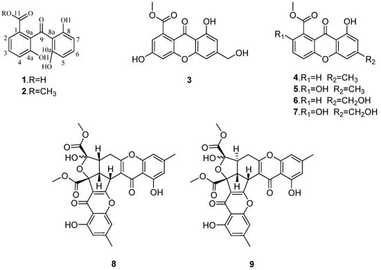 The immunosuppressive activities (IC50 values) of 1–9 and the known immunosuppressant azathioprine were calculated against Con A-induced (T cell) and LPS-induced (B cell) proliferations of mouse splenic lymphocytes, as shown in Table 2. The results showed that 1, 3, 5, and 7 possessed potent immunosuppressive activity, while the others were weak. The carboxylic acid group at C-1 (1) enhanced the immunosuppressive activity in comparison with 2 bearing a methyl ester group. The immunosuppressive activities of 5 and 7 were stronger than those of 4 and 6, suggesting that the presence of the hydroxyl group at C-2 is important for the appearance of the immunosuppressive activity of 5 and 7. However, the methyl or hydroxymethyl groups at C-6 of the xanthones are unlikely to be essential for the immunosuppressive activity (4 vs. 6 and 5 vs. 7). It was already known that the suppressive effects of substituted xanthones against the proliferation of human lymphocytes were ascribable to the positions of substituents on the xanthone nucleus [].