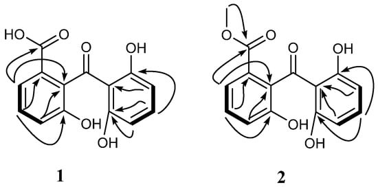 Key HMBC (black arrows) and COSY (black bold lines) correlations of compounds 1 and 2.