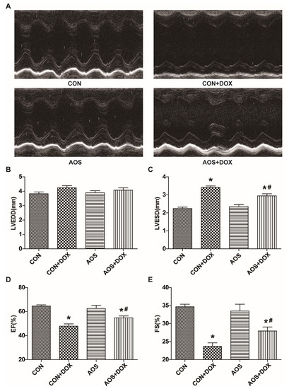 AOS pretreatment attenuates doxorubicin (DOX)-induced cardiac contractile dysfunction. (A) Cardiac function of mice receiving DOX injection with or without AOS pretreatment (200 mg/kg/day, 7 days) was measured after five days, and representative echocardiographic images were acquired; (B–E) Cardiac function was measured after five days. LVEDD: left ventricular end-diastolic dimension; LVESD: left ventricular end-systolic dimension; EF: left ventricular ejection fraction; FS: left ventricular fractional shortening. * p < 0.05 vs. the control (CON) group; # p < 0.05 vs. the CON + DOX group, n = 6 in each group.