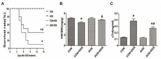 AOS pretreatment attenuates acute DOX cardiotoxicity in mice. (A) Kaplan-Meier survival curve analysis of mice after DOX injection with or without AOS pretreatment (200 mg/kg/day, 7 days). n = 10 in each group; (B) Graphs showing the heart weight to body weight ratio. HW: heart weight; BW: body weight. n = 6 in each group; (C) Evaluation of plasma cTnI levels. n = 6 in each group. * p < 0.05 vs. the CON group; # p < 0.05 vs. the CON + DOX group.