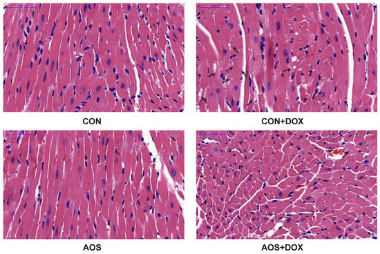 Effect of AOS pretreatment on DOX-induced myocardial histological alterations. Representative histopathological findings at 400× magnification of mouse hearts stained with hematoxylin and eosin (HE). Black arrows indicate extensive cytoplasmic vacuolization and nuclear condensation or dissolution, n = 6 in each group.