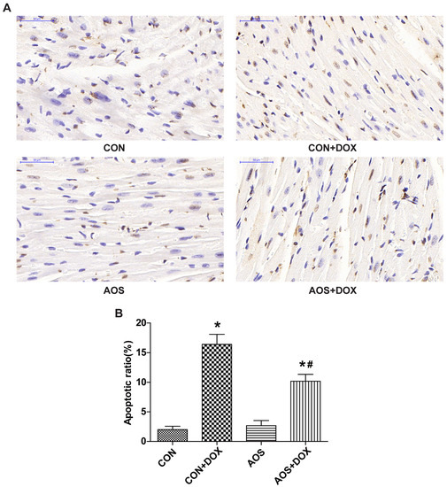 AOS pretreatment decreases DOX-induced myocardial apoptosis. (A) Representative photomicrographs at 400× magnification of mouse hearts stained with TUNEL, apoptotic cardiomyocyte nuclei appear brown-stained, whereas normal nuclei appear blue; (B) Quantitative analysis of the percentage of TUNEL-positive cells. * p < 0.05 vs. the CON group; # p < 0.05 vs. the CON + DOX group, n = 6 in each group.