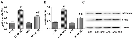 AOS pretreatment inhibits oxidative stress in the heart treated with DOX. (A,B) Quantitative analyses of gp91 phox and 4-HNE protein expression; (C) Representative blots of gp91 phox, 4-HNE and glyceraldehyde-3-phosphate dehydrogenase (GAPDH). * p < 0.05 vs. the CON group; # p < 0.05 vs. the CON + DOX group, n = 6 in each group.