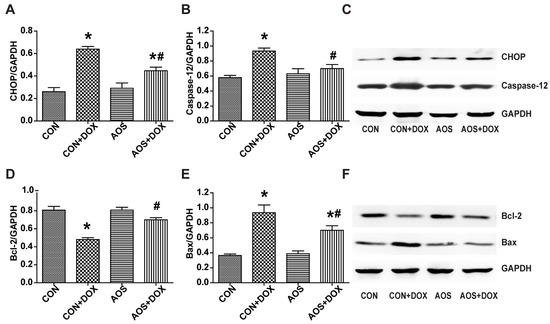 CHOP and Caspase-12 are known to be involved in endoplasmic reticulum-mediated apoptosis in the context of DOX cardiotoxicity [16,17]. Our results demonstrated that AOS by itself had no significant effect on the expressions of CHOP and Caspase-12 compared to the CON group (Figure 6A,B). CHOP and Caspase-12 protein expressions in the CON + DOX group were significantly higher than that of the CON group, and this increase was markedly abolished by AOS pretreatment (200 mg/kg/day, seven days). DOX administration significantly inhibited the expression of Bcl-2 compared to the CON group, whereas AOS pretreatment restored the expression of Bcl-2 to the normal level (Figure 6D). Bax protein expression in the CON + DOX group was significantly higher than that of the CON group, whereas AOS pretreatment significantly decreased the expression (Figure 6E). Representative western blot images are shown in Figure 6C,F.