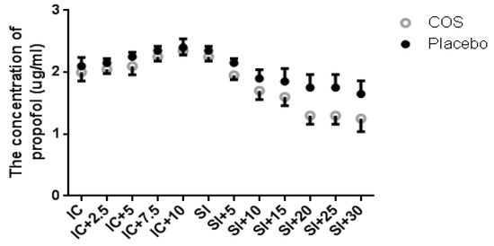 The effects of chitosan oligosaccharide (COS) on propofol requirements. All the selected subjects were evenly assigned to two groups before being injected with propofol: 10 mg/kg COS oral administration and 10 mg/kg placebo oral administration. After five min, propofol was started with step increases of 0.5 μg/mL/2.5 min until the patient lost consciousness. Propofol target-controlled infusion (TCI) was adjusted to maintain the values of bispectral index (BIS) at 50.