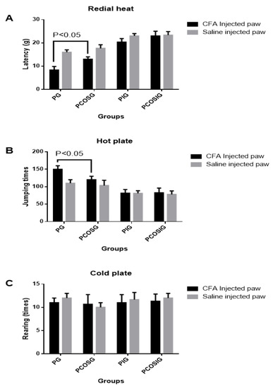Analysis of hyperalgesia in different groups. (A), radial heat analysis of complete Freund’s adjuvant (CFA)-induced thermal hyperalgesia; (B), the latency times for jumping responses after exposure to the 50-centigrade plate within 10 min; (C), rearing times after exposure to the 50-centigrade plate within 10 min. The mice received 10 mg/kg COS in dietary before 2 h propofol injection. All data were presented as mean ± S.D. and n = 8 in each group. There is statistical significance of differences if p < 0.05.