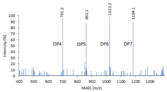 MALDI–TOF MS analysis of COS. The main products for the degree of polymerization (DP) were DP4, 5, 6 and 7 when potassium adducts ions were calculated in MALDI-TOF.