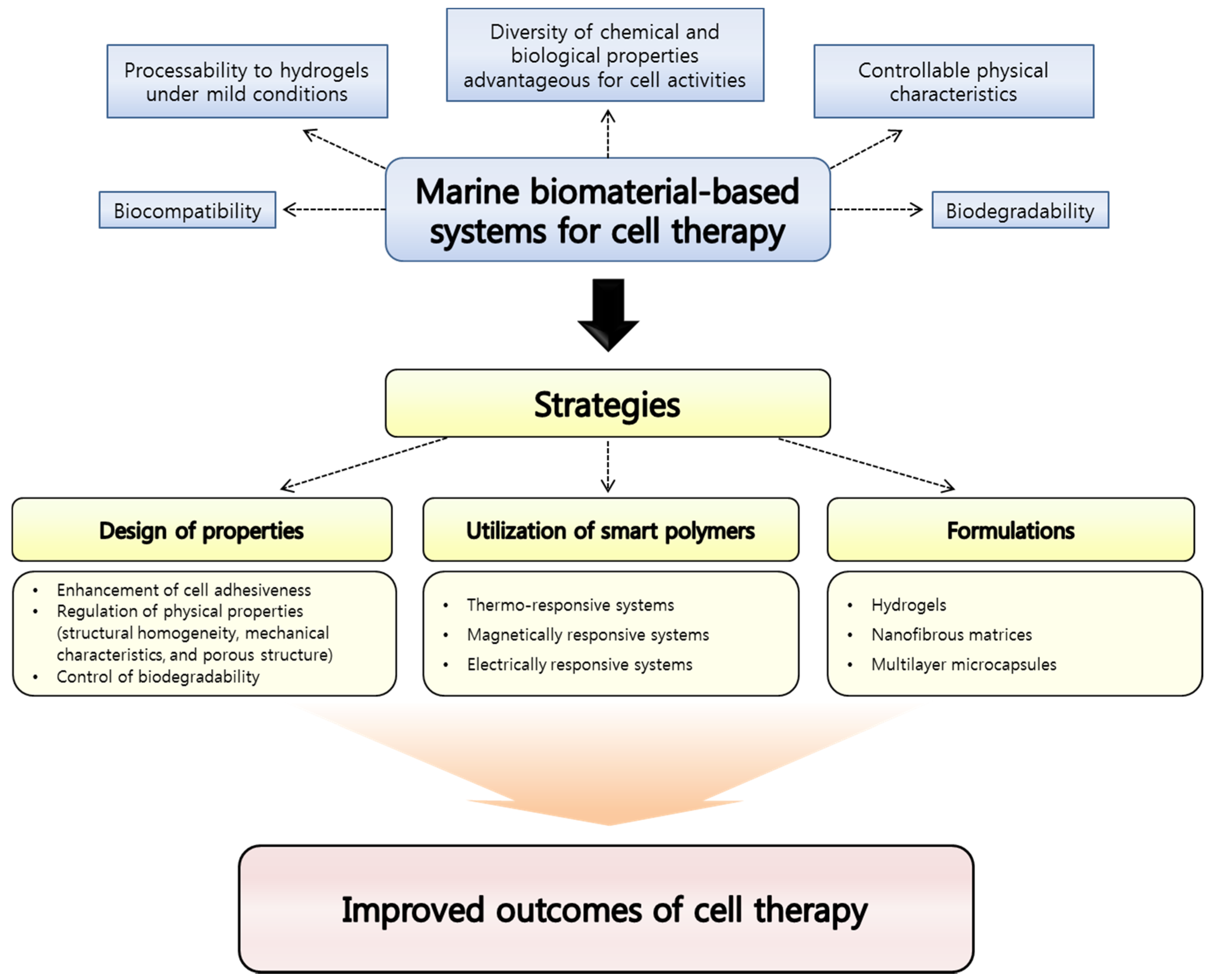 Advantages of marine biomaterials as a platform material for cell therapy applications and strategies suggested for improving outcomes.