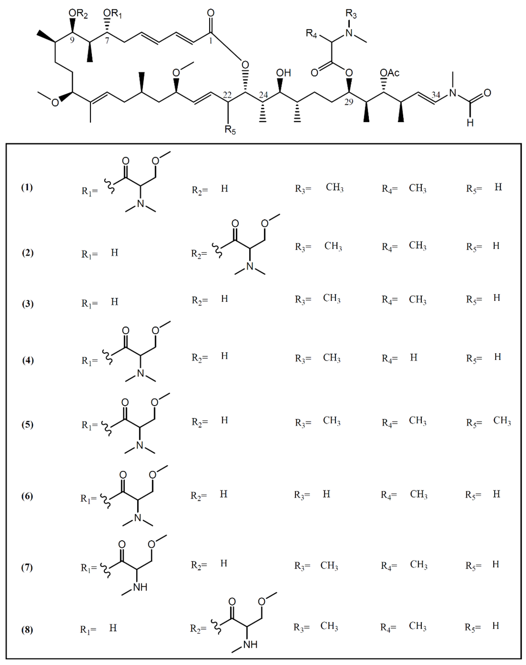 Most macrolides are known as a group of broad-spectrum antibiotics used in the treatment of common bacterial and fungal infections. Some of them, especially from marine sources, have been reported as interesting anti-cancer agents []. Marine macrolides are characterized by a highly oxygenated polyene backbone and a macrocyclic lactone []. The discovery of these typical structures in sea hares of the Aplysia genus started in 1993, when Yamada and collaborators [] isolated aplyronines A–C (1–3) (Figure 1) from the fractionation of a lipophilic extract of A. kurodai collected on the Pacific coast of Mie Prefecture (Japan). Aplyronine A (1), as well as its congeners aplyronines B (2) and C (3), proved to be in vitro potent antitumor substances, displaying IC50 values of 0.45, 2.9 and 22 nM against a human cervical carcinoma cell line (HeLa S3), respectively []. Aplyronine A (1) proved to be much more cytotoxic than aplyronine C (3), a derivative of 1 lacking the C-7 trimethylserine ester moiety []. In vivo studies developed by the same group showed that aplyronine A (1) exhibited exceedingly potent antitumor activity in mouse xenograft models (e.g., P388 murine leukemia, Lewis lung carcinoma, Ehrlich carcinoma, CT26 colon carcinoma and B16 melanoma) []. Saito et al. [], aiming to establish the anti-cancer mechanism of aplyronine A (1), studied its ability to interact with actin, the most abundant protein in the eukaryotic cytoskeleton, responsible for the regulation of various cell functions such as muscle contraction, cell mobility and cell division []. Results indicated that aplyronine A (1) has an actin-depolymerizing effect, inhibiting the velocity and the degree of actin polymerization by forming a 1:1 complex with monomeric actin. They also suggested that the C24-C34 side-chain (Figure 1) but not the macrolide ring binds to actin to depolymerize the filament []. More recent work developed by Kita and collaborators [] demonstrated that, in addition to the action of the side-chain, the actin-aplyronine A complex synergistically binds to tubulin at very low concentrations, inhibiting tubulin polymerization, and prevents spindle formation and mitosis in tumor cells. The same study showed that aplyronine C (3), which inhibits actin polymerization in vitro to the same extent as aplyronine A (1), does not bind to tubulin, explaining the substantial differences in cytotoxicity effects of compound 1 and 3 in HeLa S3 cells reported above [,,]. In addition, treatment with aplyronine A (1) at 1 nM led to potent caspase 3 activation in HeLa S3 cells, while treatment with aplyronine C (3) did not, even at 100 nM [].