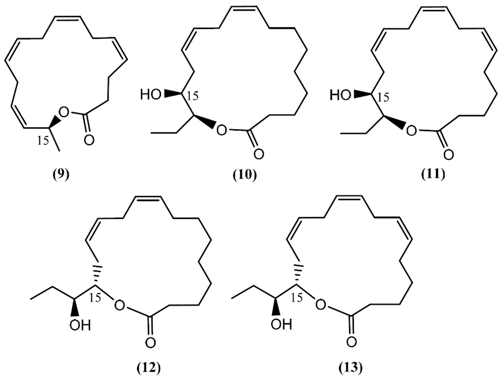 Aplyolides are unusual molecules belonging to a small group of hydroxyl fatty acid lactones isolated from marine organisms []. Aplyolides A–E (9–13) (Figure 2), five unprecedented C16 and C18 fatty acid lactones, were isolated in 1997 from the external body parts of the sea hare Aplysia depilans Gmelin collected on the Atlantic coast, Asturias (Spain), and the Mediterranean coast, Naples (Italy). The absolute stereochemistry at C-15 was determined by Mosher's method after the opening of the lactone ring []. According to the study developed by Spinella et al. [], the anatomical localization of aplyolides points to their potential biological role as defensive allomones and perhaps to the possibility of the sea hare to biosynthesize these lactones. It is interesting to note that compounds 9–13 were demonstrated to be ichthyotoxic to the mosquito fish Gambusia affinis at 10 ppm, whereas the corresponding methyl esters were completely inactive []. Although this group of molecules is associated with interesting biological activities, their paucity precludes more advanced studies.