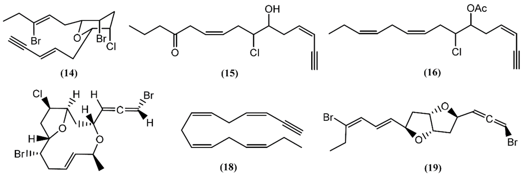 Many acetogenins, namely C15-halogenated cyclic ethers, have been found in different Aplysia species. Most of these compounds have their origin in algae, especially those from the Laurencia and Plocamium genus, which these mollusks feed [,]. A number of closely related halogenated cyclic ethers are good inhibitors of drug metabolism, some presenting ichthyotoxic and antifeedant properties [,]. The first to be isolated was dactylyne (14) (Figure 3), in 1975, an acetylenic dibromochloro ether from the sea hare A. dactylomela []. Three years later, Kaul and Kulkarni [] studied the pharmacological effect of this drug, demonstrating that it had no direct effect on the cardiovascular, respiratory, and central nervous systems of mice, rats, and guinea pigs. However, in rats, a 25 mg/kg intraperitoneal dose of dactylyne (14) inhibited pentobarbital metabolism, prolonging sleep time in mice by more than 10 h [,]. Its total synthesis was achieved by Gao and Murai in 1992 []. Chromatographic separations of the digestive and hermaphroditic glands’ organic extract of Aplysia fasciata Poiret led to the isolation of (3Z,9Z)-7-chloro-6-hydroxy-12-oxo-pentadeca-3,9-dien-1-yne (15) and (3Z,9Z,12Z)-6-acetoxy-7-chloro-pentadeca-3,9,12-trien-1-yne (16), two linear acetogenins [] with no bioactivity described until now. Dactylallene (17) was found in the digestive gland of the A. dactylomela mollusk collected in the Canary Islands, Spain. It was revealed to be ichthyotoxic and displayed interesting antifeedant activity, suggesting a defensive role against predators []. A C15-acetogenin called laurencenyne (18) was isolated from the ethanol extract of Aplysia punctata Cuvier collected from the northwest coast of Sardinia (Italy) []. It was isolated earlier from Laurencia okamurae Yamada and, due to its structure, Kigoshi and collaborators [] suggested laurencenyne (18) as a possible precursor of various nonterpenoid C15-compounds in the marine red algae of the genus Laurencia. Aplysiallene (19), a new bromoallene targeting Na+, K+-ATPase, was reported in A. kurodai and collected at the coast of Fukui (Japan) []. After being revised, the structure of aplysiallene (19) was found to match that of a bromoallene reported from L. okamurae [,].