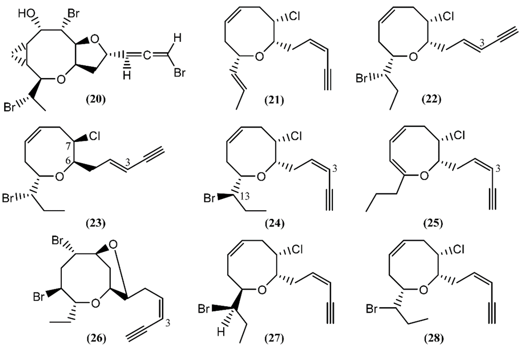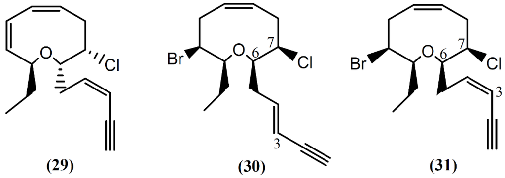 Following spectral and X-ray diffraction studies, the same group identified brasilenyne (29) in the same sample (Figure 5), a nine-membered ether ring with fish-feeding deterrent activity []. The (+)-3E,6R,7R-Obtusenyne (30) and (+)-3Z,6R,7R-obtusenyne (31), two other halogenated acetogenins containing a nine-membered ether ring, were isolated from A. dactylomela []. As far as we know, there is no study concerning the bioactivity of these two compounds. More studies regarding the mechanism of action of this class of compounds are necessary for a better understanding of the bioactivities described.