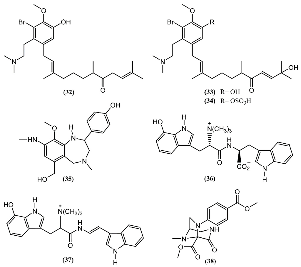 Aplysia chemical diversity and richness is also highlighted by the presence of alkaloids. Three prenylated aromatic compounds, aplaminone (32), neoaplaminone (33) and neoaplaminone sulfate (34), were isolated from A. kurodai (Figure 6) []. The biogenesis of the aplaminones may be envisaged by coupling a sesquiterpenoid with a brominated dopamine moiety []. These compounds are cytotoxic to HeLa S3 cells in vitro, displaying IC50 values of 0.28, 1.6 × 10−7 and 0.51 mg/mL, respectively [,]. Based on the enantioselective synthesis of debromoneoaplaminone, Kigoshi et al. [] established the absolute stereochemistry of aplaminone (32) and neoaplaminone (33). Another novel alkaloid, aplysepine (35), was isolated from A. kurodai by Ojika et al. []. The gross structure was elucidated, aplysepine (35) being the first 1,4-benzodiazepine alkaloid of marine origin. Moreover, the pattern of substitution of aplysepine (35) suggested a biosynthetic origin from anthranilic acid and β-phenylalanine, while other natural benzodiazepines are derived from anthranilic acid and α-amino acids. The analysis performed with a single specimen of A. dactylomela collected near Leigh Harbour (New Zealand) led to the isolation of dactylamides A and B (36–37) [], two tryptophan-derived dipeptides with no significant activity reported until now. The absolute stereochemistry of compound 36 was determined by synthesis of deoxo-diastereomers and comparison of CD spectra []. Aplaminal (38) was another alkaloid isolated from a sea hare of the Aplysia genus []. This novel triazabicyclo[3,2,1]octane framework metabolite was found in the methanolic extract of A. kurodai and its stereostructure was confirmed by X-ray crystallographic analysis []. The 3,7,8-triazabicyclooctane skeleton has not yet been reported in a natural product, although the 1,2,3-triaminopropane framework of aplaminal (38) can be found in tetrahydrofolic acid []. According to this, Kuroda et al. [] suggested a plausible biogenetic pathway for the carbon framework of aplaminal (38), based on the hydrolysis of the guanidine moiety of tetrahydrofolic acid, followed by oxidative cyclization. Compound 38 exhibited cytotoxicity against HeLa S3 cells, displaying an IC50 of 0.51 µg/mL []. Shortly afterwards, the first total synthesis of (−)-aplaminal was achieved in nine steps, with 19% overall yield [].