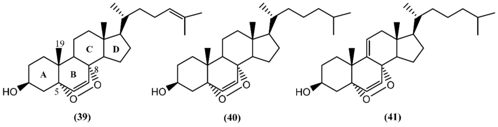 In the last decades, sterols from marine organisms such as fungus, macroalgae, sponges, corals and mollusks have shown a panoply of remarkable bioactivities, including antimicrobial [], cytotoxic [], antiviral [], and antibacterial []. In the particular case of sterols from sea hares of the Aplysia genus, Jiménez and co-authors [] described the presence of 5α,8α-epidioxy sterols (39–41) (Figure 7) in two species: A. depilans and A. punctata. Interestingly, some oxygenated sterols have also been reported from the egg masses of Aplysia juliana Quoy & Gaimard []. The endoperoxides (39–41) were isolated from the hepatopancreas (digestive gland) of A. punctata, whereas only compounds 40 and 41 were found in A. depilans []. The structure of compound 39 was confirmed by the synthesis from 25-hydroxycholesterol, in a multiple-step reaction []. Recently, Mun and colleagues [] evaluated the cytotoxicity of 5α,8α-epidioxysterol (39) against human colorectal cancer cells (HCT 116), having obtained an IC50 value of 2.5 µM. Regarding the bioactivity of 5α,8α-epidioxycholest-6-en-3β-ol (40), Clark et al. [] discovered antileishmanial properties, displaying an IC50 of 4.9 µM towards the amastigote form of Leishmania donovani, but no measurable activity against Plasmodium falciparum, Trypanosoma cruzi, and breast cancer cells (MCF-7).