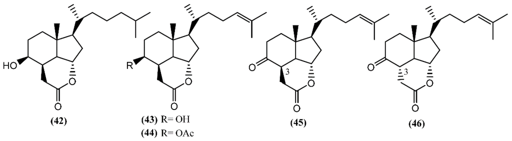 In addition to these epidioxy sterols, Aplysia mollusks are also known for the presence of families of compounds resulting from the degradation of marine steroids, entitled aplykurodins and aplykurodinones, which showed strong ichthyotoxic and cytotoxic properties [,]. The first degraded sterols to be discovered were aplykurodins A and B (42–43) (Figure 8), in A. kurodai []. Their carbon skeleton apparently derives from a dramatic oxidative degradation of the tetracyclic steroid nucleus, with the loss of ring-A carbon atoms and of the 19-methyl group (Figure 7) []. A very interesting structural feature in aplykurodins is the presence of a cis-hydrindane skeleton. Shoji and colleagues [] showed that the sterols possessing a cis-C/D ring junction act as powerful inhibitors of histamine release from rat mast cells. In 1992, a study performed with the external parts of the body of A. fasciata led to the isolation of two ichthyotoxic lactones: 4-acetylaplykurodin B (44) and aplykurodinone B (45) []. Years later, Ortega and co-workers [] isolated 3-epi-aplykurodinone B (46) from A. fasciata collected in Río San Pedro, Cadiz (Spain). Compound 46 was the last addition to the series, differing from aplykurodinone B (45) by the epimeric relationship at C-3 []. It was tested against mouse lymphoma (P-388), human lung carcinoma (A-549), human colon carcinoma (HT-29), and human melanoma (MEL-28) tumor cell lines, exhibiting mild in vitro cytotoxicity (ED50 of 2.5 µg/mL in all cases) [].