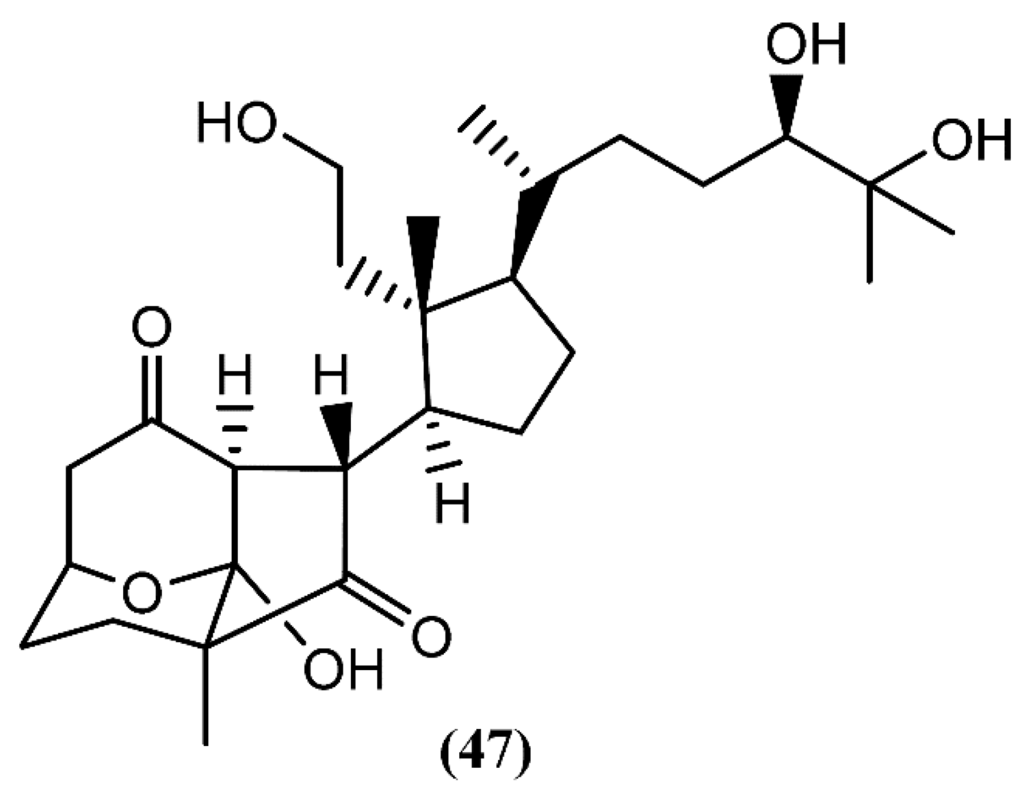 Recently, aplysiasecosterol A (47) (Figure 9), a new 9,11-secosteroid containing an unprecedented tricyclic γ-diketone structure, was isolated from A. kurodai []. A possible biosynthetic pathway for the tricyclic γ-diketone structure, having cholest-7-en-3S,5R,6R-triol as precursor, was suggested, attending to the structural similarity between both the cyclopentane ring and the side-chain part of aplysiasecosterol A (47) and those of known 9,11-secosteroids []. Compound 47 did not show significant cytotoxicity against HeLa S3 cells at 200 µM, but it exhibited moderate cytotoxicity against the human myelomonocytic leukemia (HL-60) cell line, displaying an IC50 of 16 µM []. Furthermore, this was the first molecule having this type of tricyclic ring system, which can be consider as a possible prototype for the synthesis of new analogues with interesting bioactivities.