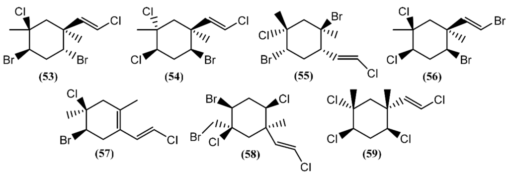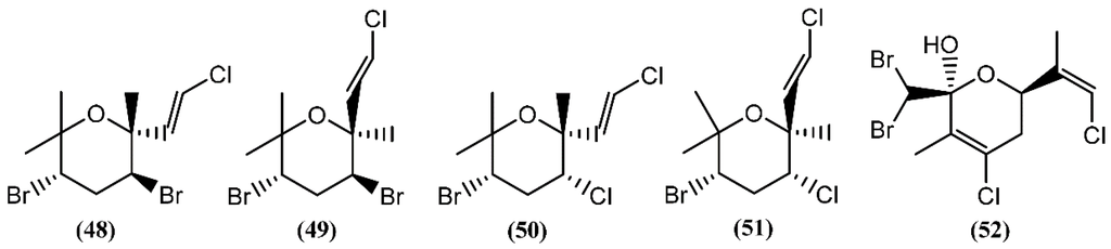 Halogenated monoterpenes may be linear or cyclic. Generally, Aplysia species are known to yield numerous polyhalogenated monoterpenes, their origin essentially being in red algae of genera Laurencia and Plocamium on which the sea hares feed []. Cytotoxicity has been reported for a few marine monoterpenes in the past years. Four cytotoxins, aplysiapyranoids A–D (48–51) (Figure 10), having a halogenated tetrahydropyran, were isolated from the midgut gland of A. kurodai []. Compounds 48–51 exhibited moderate cytotoxicity against epithelial-like monkey kidney Vero cells, and Madin-Darby canine kidney (MDCK) and mouse melanoma (B16) cell lines, with IC50 values of 19–96 μg/mL []. Aplysiapyranoid D (51) displayed interesting activity against a human colorectal carcinoma cell line (Moser) (IC50 = 14 μg/mL) []. The total synthesis of aplysiapyranoid A (48), C (50) and D (51) was achieved from simple achiral allylic alcohols by Jung and co-workers [,,], using a brominative cyclization reaction. Costatone (52), another polyhalogenated pyranoid monoterpene, was the main metabolite found in A. parvula []. It was previously described in Plocamium costatum (C. Agardh) Hooker & Harvey, a red algae which served as food for this sea hare [,,,].