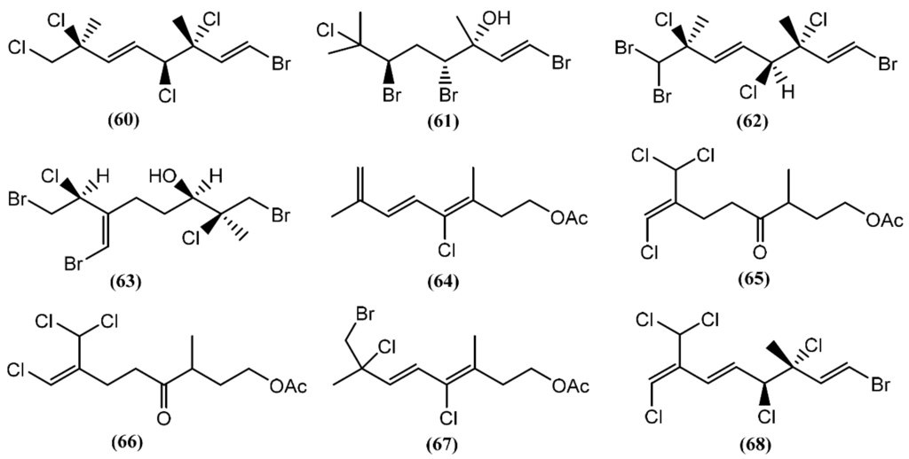 Besides compound 61, one year later, the same group found 3,7-dimethyl-1,8,8-tribromo-3,4,7-trichloro-1,5-octadiene (62) [,] in the same species. However, as far as we know, there are no studies concerning to the bioactivity of compounds 61 and 62. Kurodainol (63) was found in the gut of A. kurodai, its structure being determined by X-ray analysis []. A. punctata from Sancti Petri, Cádiz (Spain), contained four new unusual acetates of linear polyhalogenated monoterpenes (64–67) []. It was suggested that these acetates might be biotransformation products []. Compounds 65–67 showed identical cytotoxic properties against mice lymphoma (P-388) (ED50 = 2.5 μg/mL), human lung carcinoma (A-549) (ED50 = 1.5 μg/mL), human colon carcinoma (HT-29) (ED50 = 2.5 μg/mL) and human melanoma (MEL-28) (ED50 = 1.5 μg/mL) cell lines []. Another linear monoterpene, (1E,5E,7E)-1-bromo-7-dichloromethyl-3,4,8-trichloro-octa-1,5,7-triene (68), was isolated from A. dactylomela []. Compound 68 demonstrated significant cytotoxicity toward three cancer cell lines (HM02, HEP G2, and MCF 7), displaying IC50 values of 1.1, 1.0 and 1.5 μg/mL, respectively [].