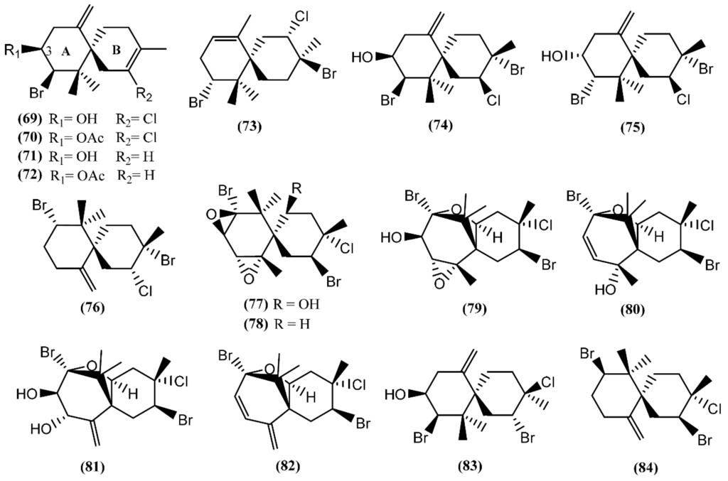 Halogenated chamigrane derivatives are regular sesquiterpenes with a spiro center []. Concerning the marine environment, secondary metabolites possessing this skeleton are characteristic of the red algae of the genus Laurencia and of the sea hare grazing on them []. Elatol (69), acetylelatol (70), deschlorelatol (71), acetyldeschlorelatol (72) and compound 73 (Figure 13) were isolated from the acetone extract of A. dactylomela digestive glands collected from the southwest coast of La Palma Island []. Elatol (69) has already displayed a diversity of biological activities, such as parasiticide against the amastigotes of Trypanosoma cruzi and Leishmania amazonensis [,], anti-tumor [], antibacterial against some marine bacteria [] and larvicidal against the dengue mosquito Aedes aegypti []. A recent study developed by Desoti et al. [] found that the trypanocidal action of (−)-elatol might involve the induction of the autophagic and apoptotic death pathways triggered by an imbalance of the parasite’s redox metabolism. The cytotoxic effect of elatol (69) is due to its capacity to induce cell cycle arrest in the G1 and the sub-G1 phases, leading cells to apoptosis []. It is of note that elatol (69) and acetylelatol (70) showed cytotoxic activity against Vero cells, displaying IC50 values of 25 and 44.6 µM, respectively, while deschloroelatol (71) and its acetyl derivative (72) were inactive []. This result indicates the relevance of the chlorine atom and of the free hydroxyl group in C-3 of the A-ring to the cytotoxicity toward Vero cells. Moreover, elatol (69) and deschloroelatol (71) exhibited some antifungal properties against Mycotypha microspore and Eurotium repens, with compound 71 being more active []. In addition to compound 69, Vairappan and co-authors [] described the isolation of iso-obtusol (74) from A. parvula, while Díaz-Marrero et al. [] reported the isolation of the chamigrenes iso-obtusol (74) and obtusol (75) from A. dactylomela. Compound 74 exhibited antibacterial activity against Klebsiella pneumonia and Salmonella sp., equalizing the potency of commercial antibiotics against these two bacteria []. Moreover, as compound 69, iso-obtusol (74) also displayed in vitro and in vivo leishmanicidal activity []. On the other hand, compound 75 demonstrated significant cytotoxicity toward three cancer cell lines (HM02, HEP G2, and MCF 7) and moderate antimicrobial activity []. Recently, another chamigrene, named epi-obtusane (76), has been isolated from an acetone extract of the digestive gland of Aplysia oculifera Adams & Reeve, showing in vitro cytotoxicity against different human cancer cell lines (PC-3, A549, MCF-7, HepG2 and HCT 116), with IC50 values in the low µg/mL range []. Continuing with chamigrane sesquiterpenes, Kaiser et al. [] found prepacifenol and dehydroxyprepacifenol epoxides (77–78) in A. dactylomela collected from Brazilian waters. Prepacifenol epoxide (77) was previously reported in the digestive gland of A. californica []. This halogenated sesquiterpene diepoxide seems to be the precursor of johnstonol (79) [], a chamigrane also found in A. dactylomela from Brazilian waters [] and in the digestive gland of A. californica [].