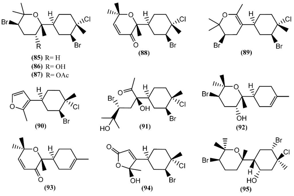 The bisabolane skeleton develops from the cyclization of the geranyl cation and results in the formation of a monocyclic ring structure []. This type of compound appears to be among the simplest of sesquiterpenes, because of their structures; however, the bisabolane derivatives isolated from sea hares of the Aplysia genus contain a bicyclic ring structure (Figure 14). Six modified bisabolane sesquiterpenes, caespitane (85), caespitol (86), 8-acetylcaespitol (87), caespitenone (88), laucapyranoid A (89) and furocaespitane (90), were isolated from three distinct samples of A. dactylomela []. Compounds 85 and 86 exhibited activity in a brine shrimp bioassay in the range of 100% lethality within 24 h, dropping to 40% after 48 h []. Moreover, caespitol (86) displayed algicidal and nematocidal effects toward Caenorrhabditis elegans [], and very weak cytotoxicity against HeLa 229 cells, presenting an IC50 of 100 µg/mL []. It is worth mentioning that small changes in chemical structures can have a pronounced influence on bioactivity. Accordingly, Wessels et al. [] showed that 8-acetylcaespitol (87), which only differs from caespitol (86) in the acetyl group, was completely inactive in the same assays. Caespitenone (88) is an oxidation product of the algal metabolite caespitol (86) and is probably produced by the animal through the oxidation of the diet-derived natural product []. It was found to be active against HT29, MCF7 and A431 cell lines, exhibiting an IC50 of 18.9, 19.7 and 21.6 µM, respectively []. Studies regarding the bioactivity of laucapyranoid A (89) and furocaespitane (90) are necessary to evaluate the influence of the double-bound position in the tetrahydropyran ring and the impact of the furan ring, respectively. Another study with A. dactylomela led to the isolation of aplysiadactydiol (91), deschlorobromo caespitol (92), deschlorobromo caspitenone (93) and furocaespitanelactol (94) []. The same authors suggested compound 91 as a key intermediate for a unified biogenesis of regular and irregular marine algal bisabolene-type metabolites that are also present in sea hares []. Deodactol (95), an antineoplastic sesquiterpene isolated from A. dactylomela, was moderately cytotoxic to the L1210 cell line, with an ED50 of 12 µg/mL [].