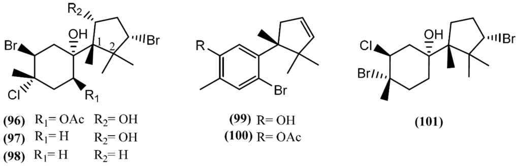 Cuparane sesquiterpenes are present in some marine organisms, liverworts and higher plants [,]. In those metabolites comprising a cuparane core, carbons 1 and 2 from the aliphatic portion are substituted with a methyl group and dimethyl groups, respectively (Figure 15) []. A. dactylomela, collected at the Eastern Cape coast of South Africa, yielded algoane (96), 1-deacetoxyalgoane (97) and 1-deacetoxy-8-deoxyalgoane (98) (Figure 15) []. Two other cuparane sesquiterpenes with unprecedented oxygenation patterns, namely cupalaurenol (99) and cupalaurenol acetate (100), were isolated from A. dactylomela []. Since cupalaurenol (99) is reported in algae of the Laurencia genus, the acetylation of compound 99 seems to occur inside the sea hare []. Compound 99 exhibited potent inhibition against Staphylococcus sp., Staphylococcus aureus, and Salmonella sp., presenting a minimum inhibitory concentration (MIC) of 125 µg/mL for all strains []. More recently, oculiferane (101) was isolated from the digestive gland of A. oculifera []. Compound 101 showed the same in vitro cytotoxicity reported for epi-obtusane (76), being significantly more active against A549 cells [].