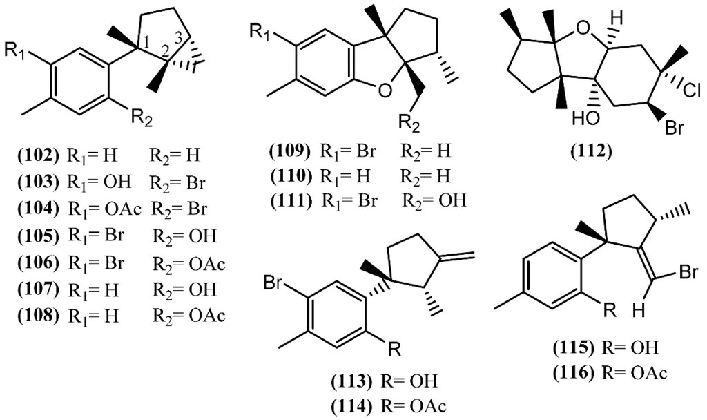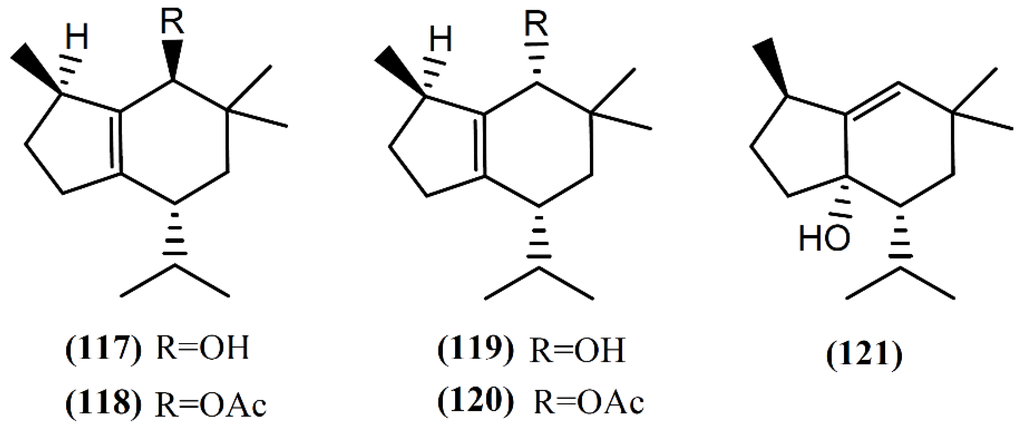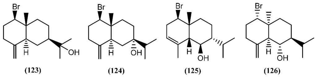 The brasilane skeleton has the basic structure of octahydro-1,6,6-trimethyl-4-(1-methyl)-1H-indene []. Two non-halogenated sesquiterpenes (Figure 17), brasilenol (117) and brasilenol acetate (118), have been isolated along with epibrasilenol (119), from the digestive glands of A. brasiliana collected along the coast of Texas []. In addition to these brasilane-type sesquiterpenes, Ioannou and colleagues [] isolated epibrasilenol acetate (120) and 6-hydroxy-1-brasilene (121) from the organic extract of digestive and hermaphroditic glands of A. punctata. The structure of brasilenols was established by detailed spectral analysis and limited chemical conversions. The methyl, isopropyl, and hydroxyl groups and the tetrasubstituted double bond were defined by spectral analysis []. As far as we are aware, the bioactivity of these compounds has not been reported yet.