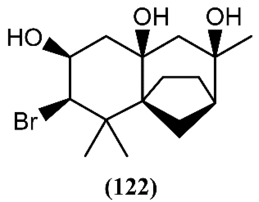A few years ago, dactylomelatriol (122), the first naturally occurring omphalane-derived sesquiterpene from the marine environment, was extracted from A. dactylomela [] (Figure 18). This skeleton was encountered for the first time in a liverwort [] and its structure and relative configuration were established by spectroscopic evidence []. According to its structure, Diaz-Marrero and colleagues [] proposed a biogenetic route, from deschloroelatol (71) until the formation of the rhodolaurane skeleton intermediate, which can undergo a 1,2-shift to generate the omphalane ring system. Compound 122 was tested for its antimicrobial capacity, but revealed to be inactive []. However, more studies involving different assays and bioactivities are necessary and could lead to promising results.