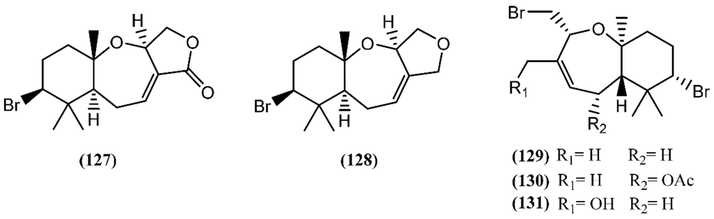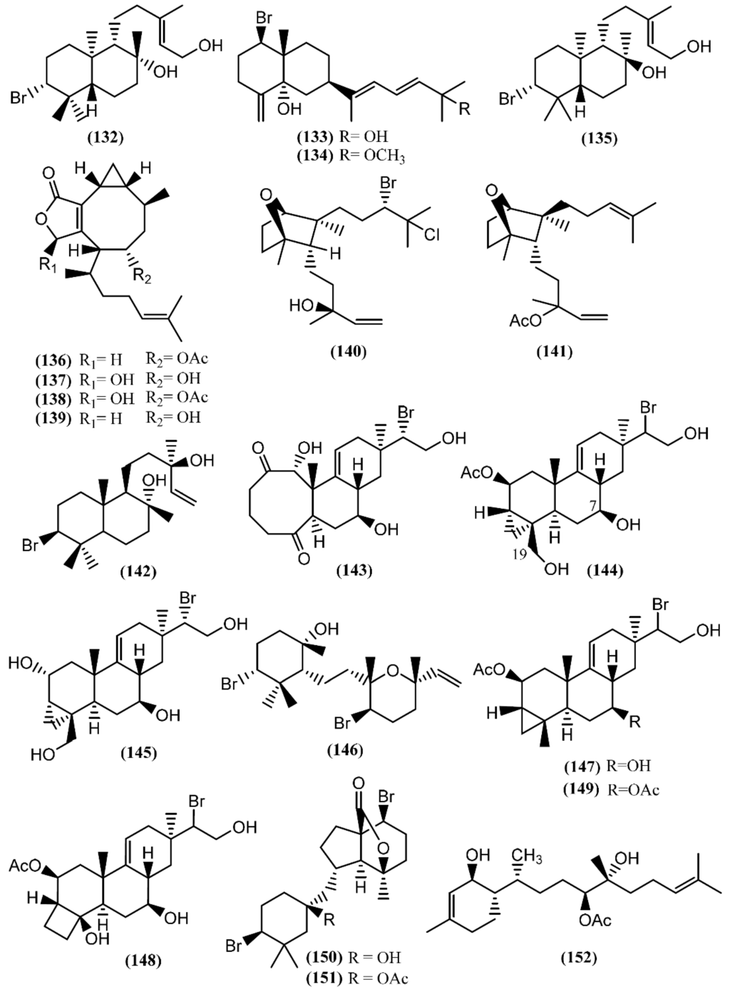Marine diterpenes have been isolated from both animals and plants. Although red algae of the genus Laurencia mainly produce bromine-containing metabolites with sesquiterpenic skeletons, there are several examples of bromine diterpenes as well. The first halogenated diterpenoid, aplysin-20 (132) (Figure 21), was found in A. kurodai []. Further studies on the same species led to the brominated diterpene aplysiadiol (133), together with the methyl ether derivative (134), which contains a rare extended sesquiterpenic skeleton of a prenylated eudesmane []. The presence of compound 133 in Aplysia has a probable origin in the diet, as it was also found in the red algae Laurencia japonensis T.Abe & Masuda []. Compound 133 exhibited a potent effect against Staphylococcus sp., S. aureus and Salmonella sp. []. Studies involving A. kurodai yielded epi-aplysin-20 (135), an epimer of 132 [].