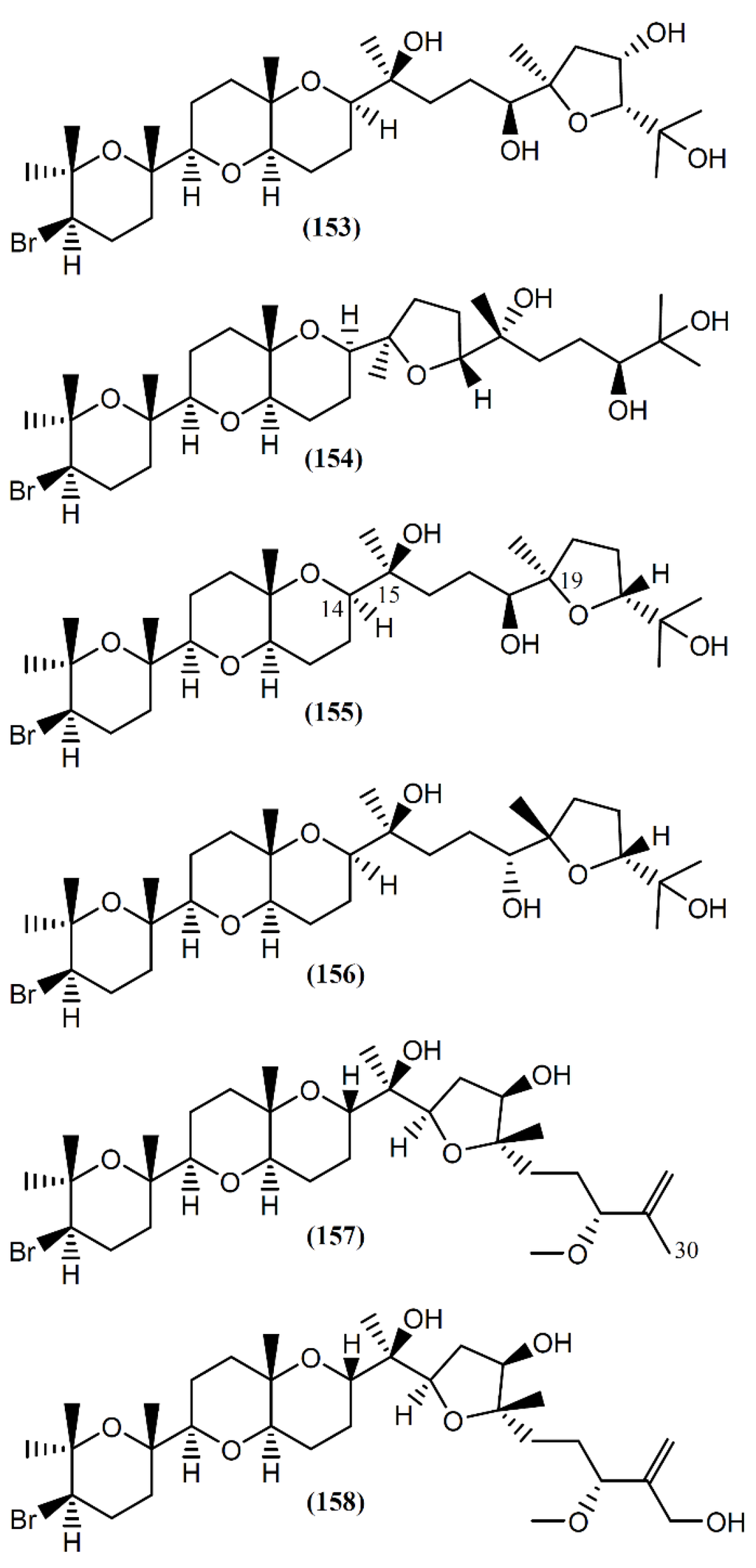 Aplysqualenols A (157) and B (158), brominated triterpenes structurally related to thyrsiferol, were isolated from two specimens of A. dactylomela collected in Puerto Rico []. A biogenetic pathway for compound 157 was suggested, compound 158 being posteriorly obtained by enzymatic hydroxylation at C-30 []. Upon screening by the National Cancer Institute’s (NCI’s) in vitro antitumor assay, containing 60 human tumor cell lines, the squalene-derived polyether 157 exhibited inhibitory activity against SNB-19 Central Nervous System (CNS) cancer cells and T-47D breast cancer cells, with IC50 values of 0.4 and 0.3 µg/mL, respectively []. Furthermore, aplysqualenol A (157) revealed antiviral properties against herpes simplex virus type 1 (HSV-1) and type 2 (HSV-2), varicella zoster virus (VZV) and human cytomegalovirus (HCMV), and remarkable toxicity against Epstein-Barr virus (EBV), with no accompanying toxicity seen in the host Daudi cells []. Regarding antiplasmodial activity, compounds 157 and 158 showed moderate effect toward Plasmodium falciparum, with IC50 values of 11 and 18 µg/mL, respectively [].