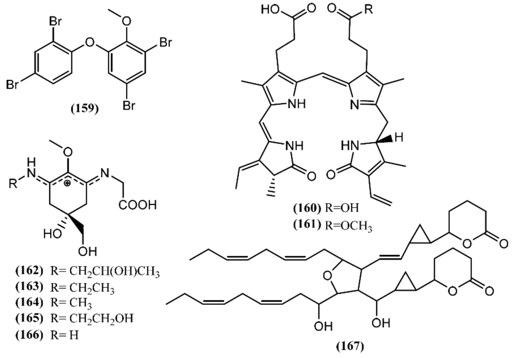 A polybrominated diphenyl ether (159) (Figure 23) was detected in the green alga Cladophora fascicularis and isolated from the digestive gland of A. dactylomela []. Compound 159 exhibited potent anti-inflammatory properties and antibacterial activity against Escherichia coli, Bacillus subtilis, and Staphylococcus aureus [].