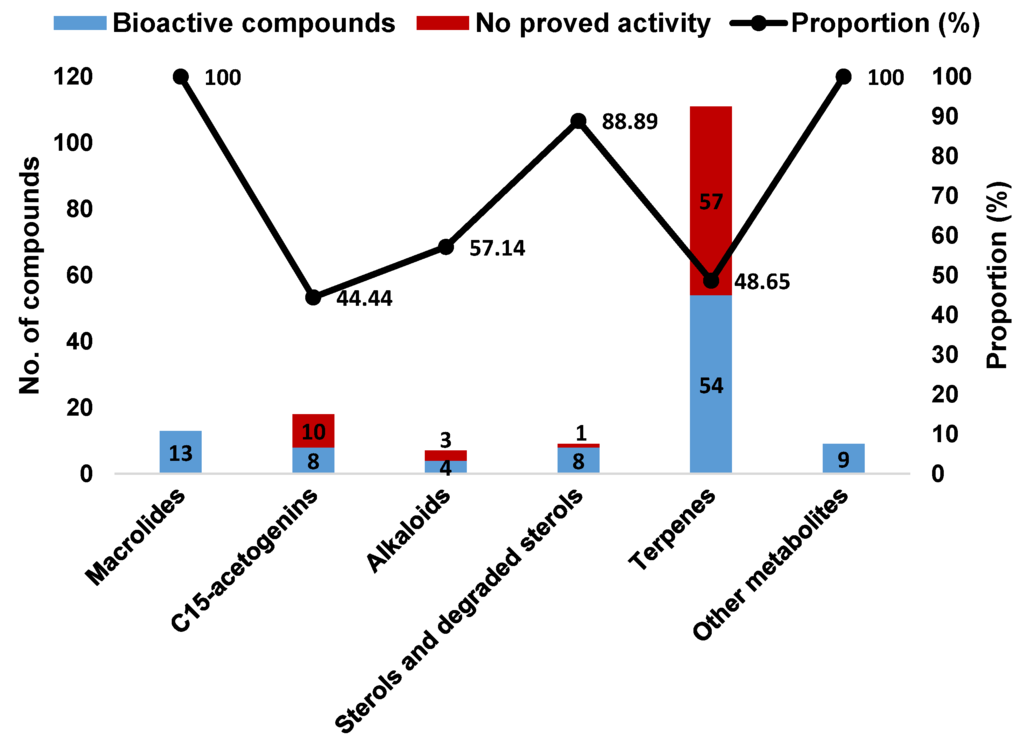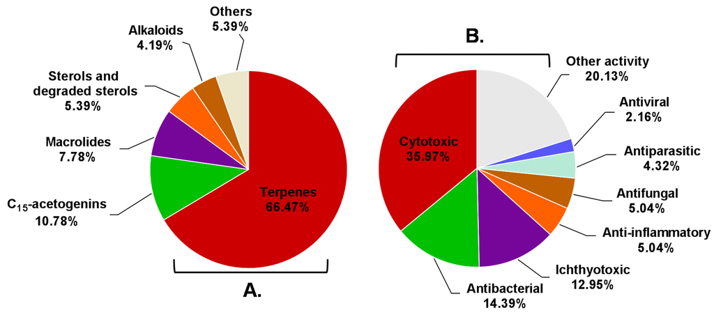 The first approach on secondary metabolites of a shell-less gastropod dates back to 1963, when Yamamura and Hirata isolated different sesquiterpenes from specimens of Aplysia kurodai Baba []. In 2006, Kamiya and co-authors briefly reviewed some bioactive molecules from sea hares []. Since then, a huge number of molecules have been discovered, especially from sea hares of the Aplysia genus. More recently, two articles appeared establishing the fatty acid [] and carotenoid [] composition of different Aplysia sea hares by GC-MS and LC-DAD, respectively. However, the current review emphasizes the secondary metabolites effectively isolated from sea hares of the Aplysia genus and their biological properties. For this purpose, the compounds were systematized according to their chemical class in macrolides, C15-acetogenins, sterols, monoterpenes, sesquiterpenes, diterpenes and triterpenes, among other metabolites.