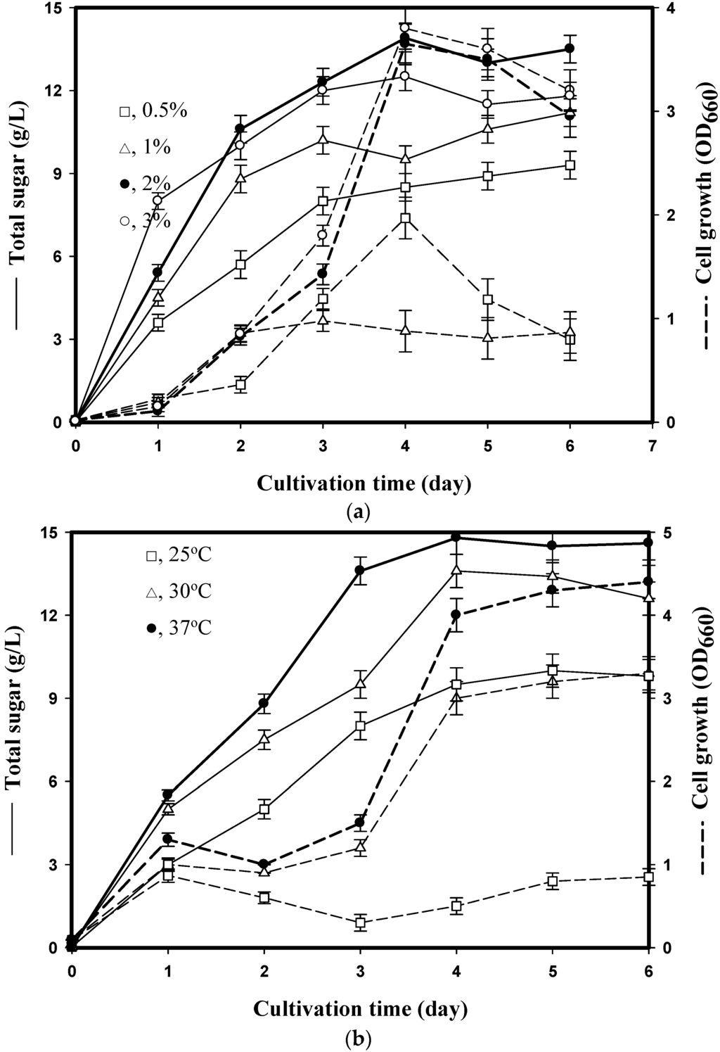 Incubation temperature is another critical factor for EPS biosynthesis [2]. In a preliminary step, P. mucilaginosus TKU032 was cultured at three different temperatures, 4, 25 and 55 °C, to respectively represent psychrophilic, mesophilic and thermophilic conditions. It was found that P. mucilaginosus TKU032 belonged to the mesophilic bacterium. Moreover, P. mucilaginosus TKU032 was isolated from soils and the temperature of the environment is below 37 °C. Consequently, bacteria were cultured in conical flasks under the conditions described above (2% (w/v) SPP, 50 mL, 150 rpm) for 6 days at various temperatures (25 °C, 30 °C, 37 °C). The optimal temperature for EPS production was 37 °C for 4 days at which point the total sugar content reached 14.8 g/L (Figure 1b).