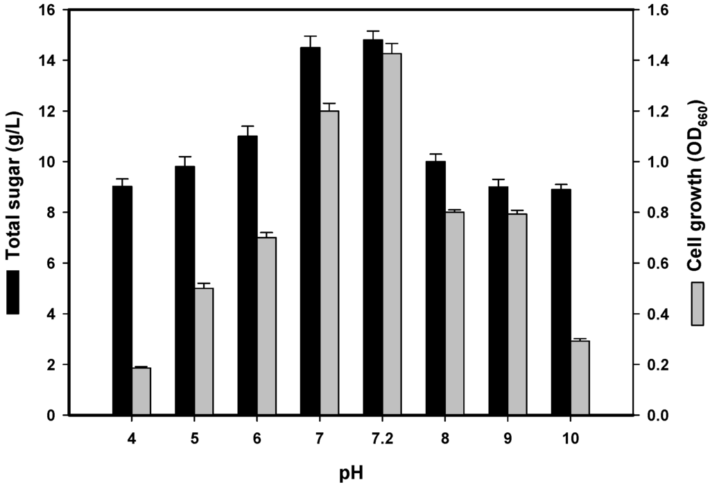 The initial culture pH is also an important factor that may affect the cell membrane, morphology and structure as well as the uptake of various nutrients and the rate of EPS biosynthesis [2,11]. As shown in Figure 2, the optimal pH value for EPS production was 7.2 before sterilisation (i.e., unadjusted pH), which corresponded to a total sugar content of 14.8 g/L after cultivation. This result was similar to that observed from soil-derived P. polymyxa strains [19,20], but unlike the slightly alkaline (pH 8) conditions required for EPS production by P. polymyxa EJS-3 [2]. As a neutral pH was more suitable for TKU032 EPS production, subsequent experiments were conducted with an unadjusted pH of 7.2.