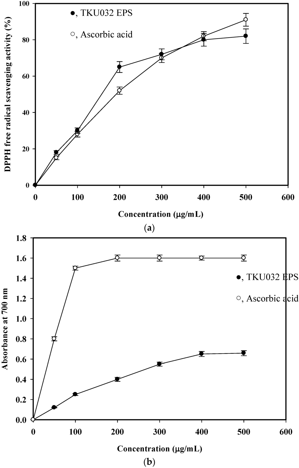 DPPH free radical scavenging ability (a) and reducing power (b) of EPS fraction from P. mucilaginosus TKU032. All data points are means ± S.D. (standard deviation) of three different experiments performed on different days (each experiment was conducted in triplicate).