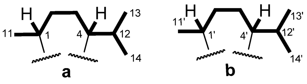 The C-H correlations from a heteronuclear single quantum coherence (HSQC) experiment established the one bond connectivity between the carbons and protons (Table 1). The H-H correlations from a correlation spectroscopy (COSY) experiment furnished two similar segments; a and b, shown in Figure 2, leaving an additional isolated strong coupled methylene group (δH 3.35 and 2.53 ppm) and four isolated proton signals (δH 6.36, s, 1H; 4.39, s, 1H; 3.74, s, 3H; 1.33, s, 3H) uncorrelated. Segments a and b are similar each other and both to the aliphatic portion of the calamenene sesquiterpenes (2–4) [10].