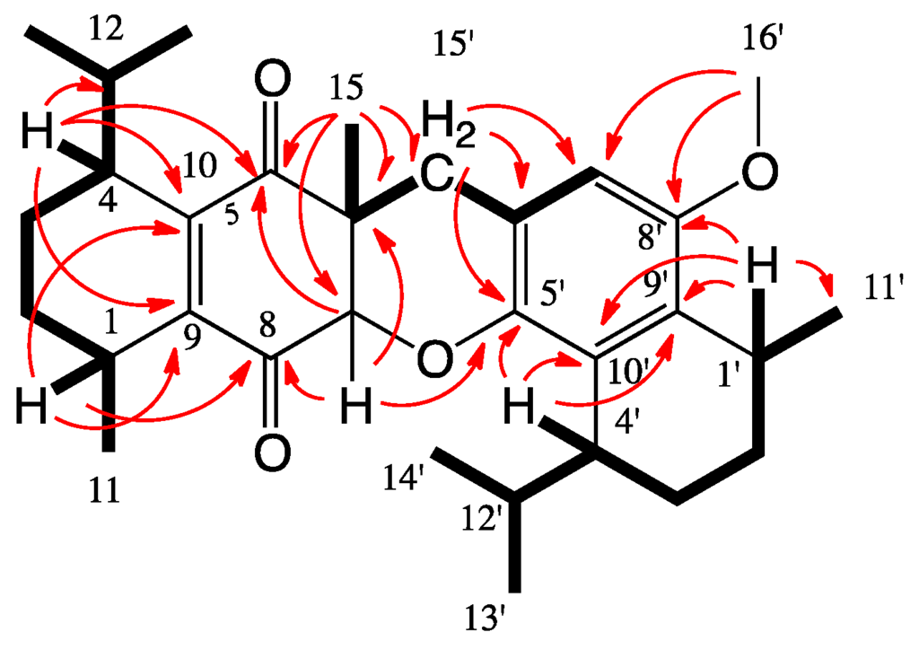 Using long-range C-H correlations from a heteronuclear multiple bond correlation (HMBC) experiment enabled the connection of all the proton and carbon signals to the final gross planar structure of 1 (Figure 3). H-1 and -4 exhibited correlations with C-8 and -5, respectively, and both with C-9 and -10, extending fragment a to a 1-isopropyl-4-methyl-2-cyclohexene moiety substituted at positions 2 and 3 by two ketone groups. Oxymethine-7 presented HMBC correlations with C-5, -6, -8 and -9, while methyl-15-protons exhibited correlations with C-5, -6, and -7, closing a second six-membered ring. H-1′ and -4′ demonstrated a similar pattern of correlations (Figure 3), extending fragment b to a 1,4-disubstituted cyclohexene ring. H-7′ exhibited HMBC correlations with C-1′, -5′, -6′, -8′, -9′ and -15′, while methylene-15′-protons presented correlations with C-5′, -6′, -7′ and -8′, and the methoxy-protons exhibited correlations with C-8′, supporting a substituted 15-methylene-8-methoxy-5-oxy-calamenene substructure. The HMBC correlations of H-7 with C-5′ and -15′, of methyl-15-protons with C-15′ and of both protons of methylene-15′ with C-5, -6 and -7 suggested the connection of C-6 with C-15′ and C-7 through the oxygen to C-5′, establishing the planar structure of 1.