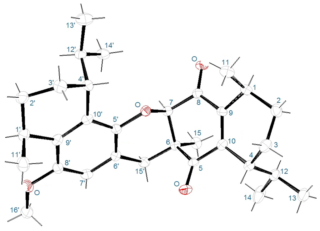Crystallization of bisdioxycalamenene (1) from CHCl3/MeOH solution furnished suitable crystals for an X-ray diffraction analysis. Bisdioxycalamenene (1) comprises of a pentacyclic structure derived from coupling of two sesquiterpenes. The asymmetric unit contains assemblages of two molecules of 1, thus in one monoclinic cell there are four molecules of 1. Anomalous dispersion effects and relation of the two enantiomeric forms of the structural model to the diffracted intensities established the absolute configuration. The preferred fit is indicated by the Flack and Parsons parameter (Flack parameter, x = 0.01 (9)) [13]. The X-ray diffraction analysis established the complete structure of 1 including the absolute configuration of the six chiral centers (1S,1′S,4R,4′R,6S,7R) shown in Figure 4.