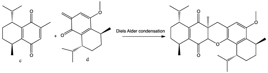 To the best of our knowledge, there are no earlier reports of such a skeleton. A possible biogenetic route to 1 is a hetero Diels Alder condensation of the para-quinone c with the ortho-quinonemethide, d [14,15] (Figure 5).
