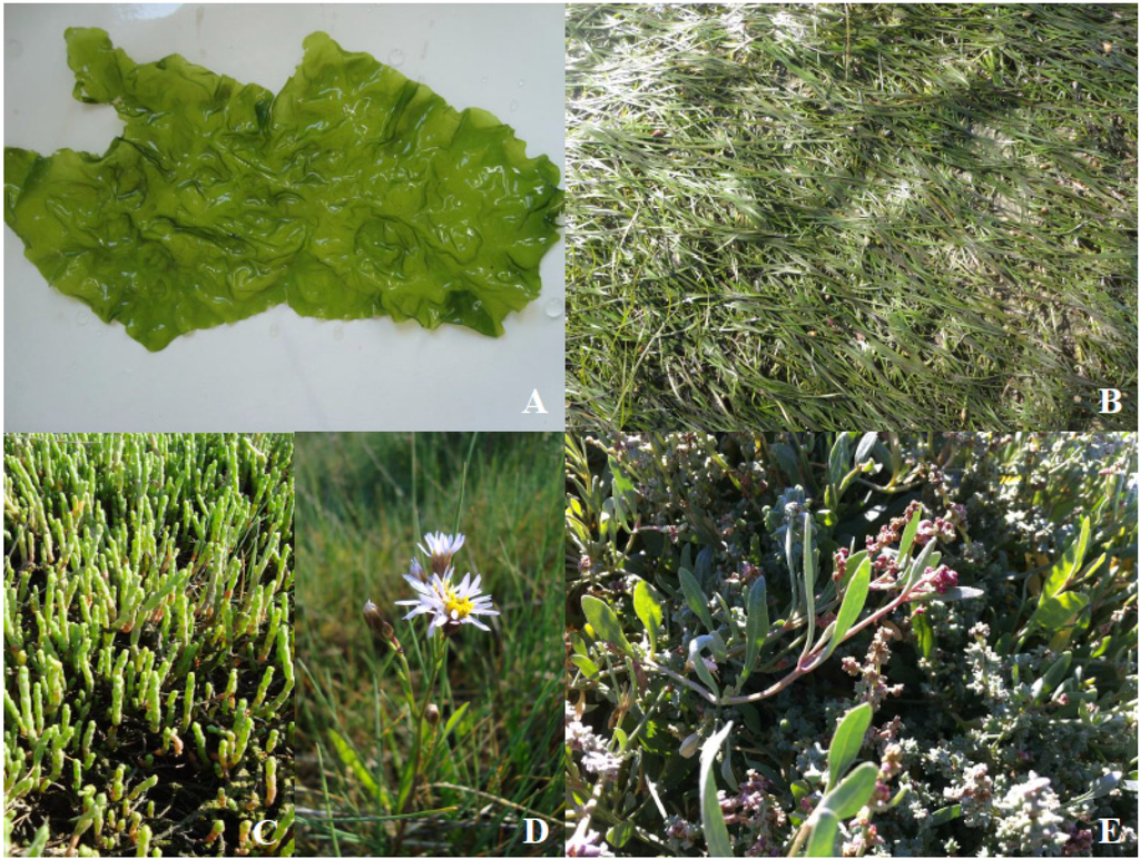 Marine macrophytes: (A) Ulva lactuca (green macroalgae); (B) Zostera noltii (seagrass); (C) Salicornia ramosissima (halophyte non-seagrass); (D) Aster tripolium (halophyte non-seagrass); and (E) Halimione portulacoides (halophyte non-seagrass). Images (A,C,D) by Ana I. Lillebø; (B) by Ana. I. Sousa; and (E) by Bruna Marques.