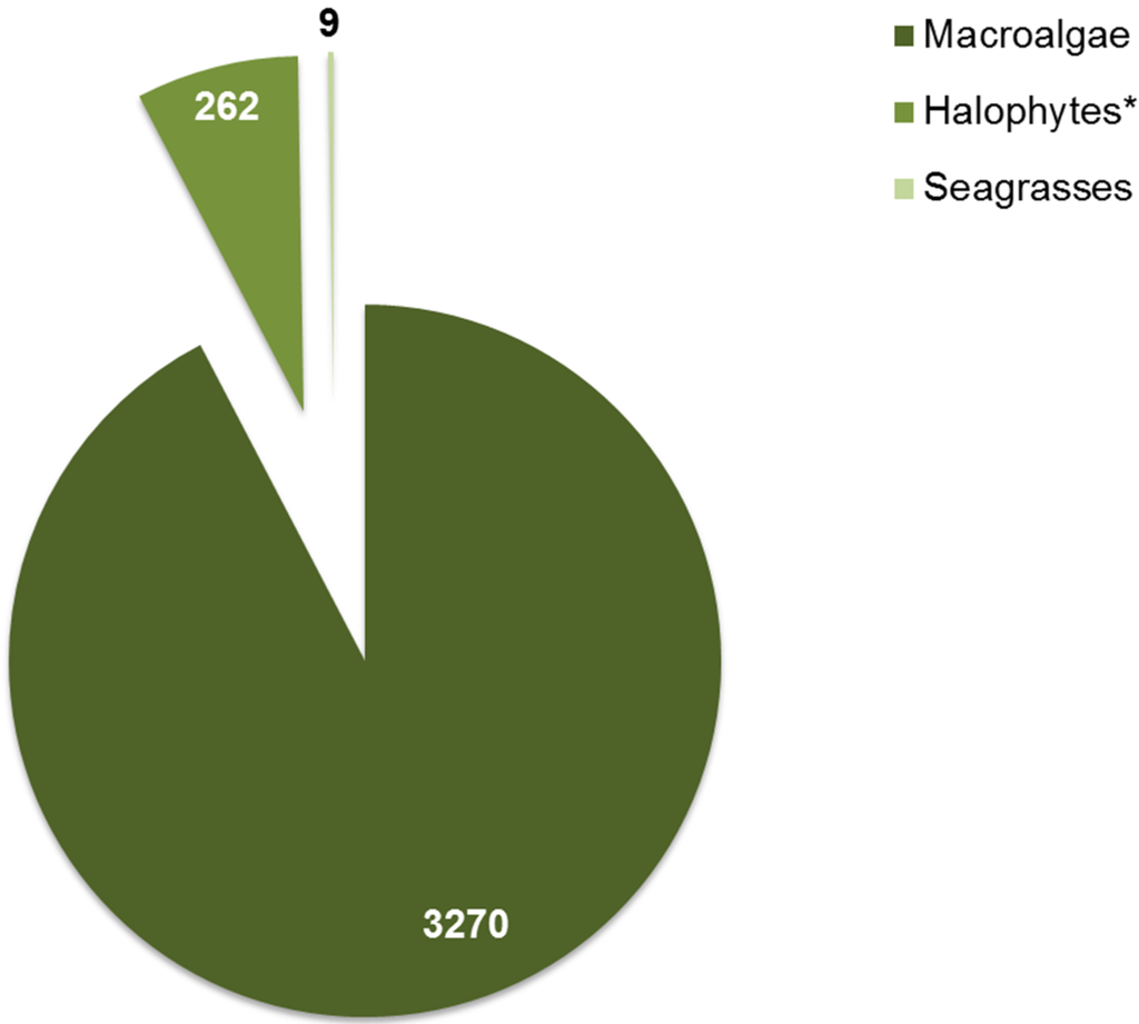 Number of marine natural products discovered from macroalgae, halophytes (* excluding seagrasses) and seagrasses between 1940 and 2014 [].