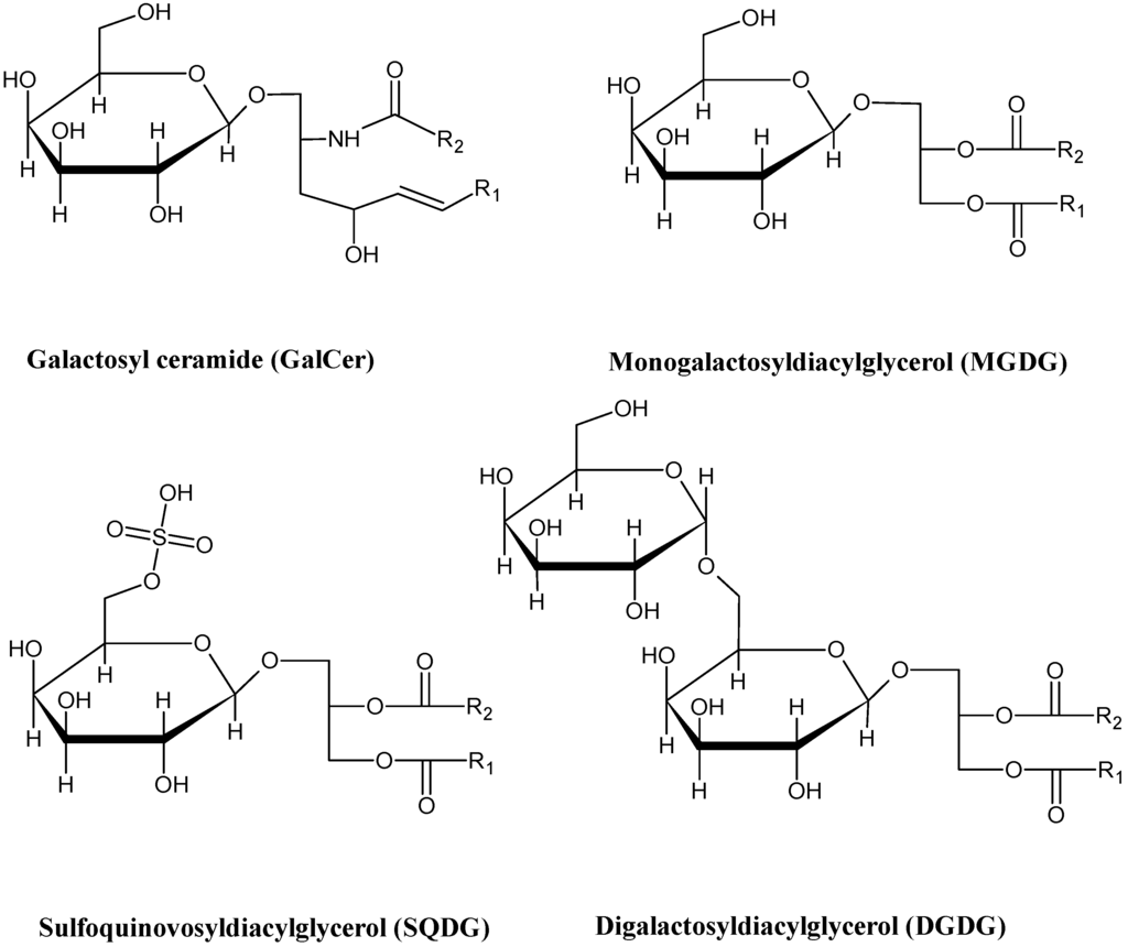 Glycolipids (GLs) constitute an important class of membrane lipids that are synthesized by prokaryotic and eukaryotic organisms. Generally, they are glycosylated derivatives of acylglycerols, termed glycoglycerolipids, and ceramide derivatives, termed glycosphingolipids. Glyceroglycolipids are the predominant GLs in marine macrophytes. Overall, marine macrophytes synthesize three major types of GL: the glycosylglycerides monogalactosyldiacylglycerides (MGDG), digalactosyldiacylglycerides (DGDG), and sulfoquinovosyldiacylglycerides (SQDG) (Figure 3).