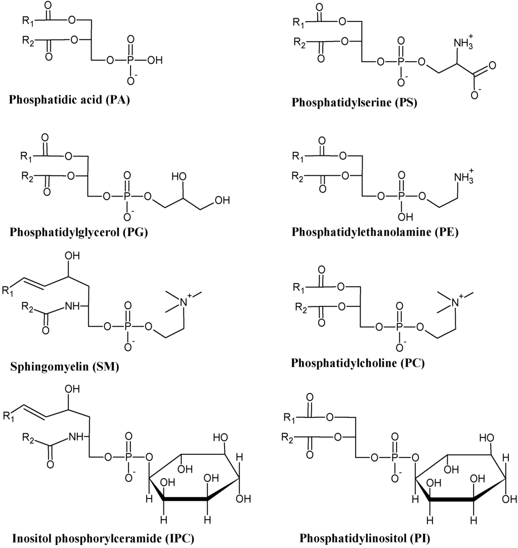 Glycerophospholipids, also known as phospholipids (PLs), are polar lipids that structurally consist of a glycerol molecule linked to two FAs by an ester bond and a phosphate group that can bind a polar molecule. This portion of the PL molecule is called the head group. The composition of the head group is primordial in the classification of PLs into distinct classes. For example, if the head group is a serine, then the PL belongs to the PS class. Other classes include PC, PE, PG (Figure 4). Each class of PL includes a large number of molecular species due to the presence of different combinations of fatty acyl chains that can be linked to glycerol moiety. Overall, the phospholipid profile encompasses a great number of molecular species that can be structurally different and its quantities can vary with location and environmental conditions [,]. The quantity and composition of PLs is enzymatically regulated in a way that enables membranes to maintain their structure and function, in spite of their developmental stage and/or environmental variation [].