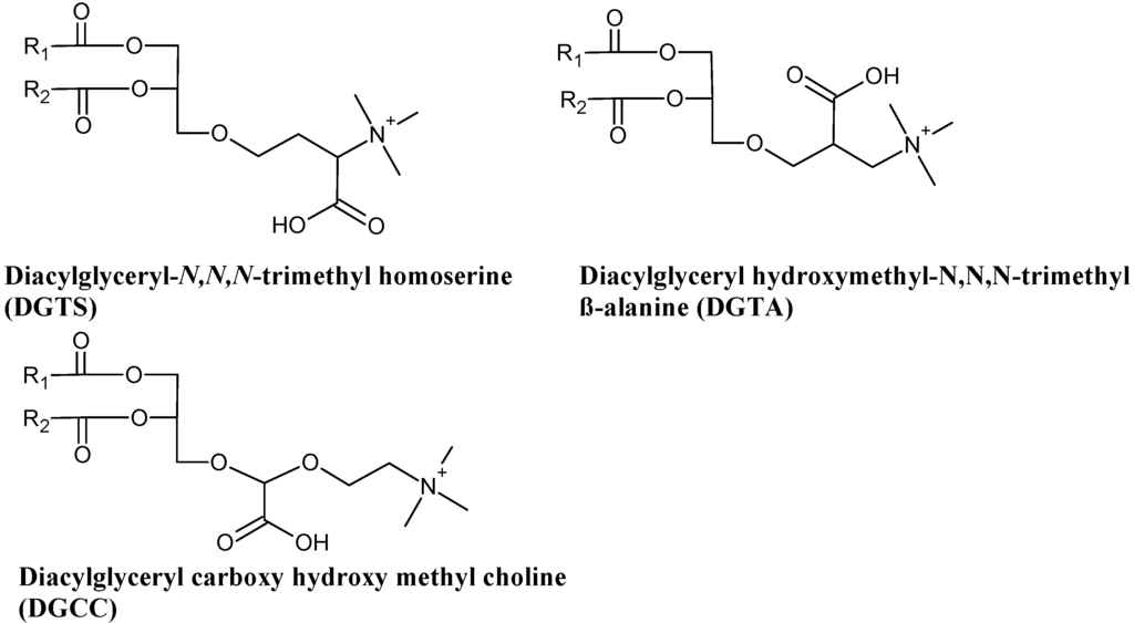 Betaine lipids are a class of acylglycerolipids that have a quarternary amine alcohol ether-linked to a diacylglycerol moiety and lack phosphorous. They are zwitterionic at neutral pH due to their positively charged trimethylammonium group and negatively charged in carboxyl group. They can be found in lower plants and algae. Currently, three types of betaine are known to occur in macroalgae: diacylglyceryl-N,N,N-trimethylhomoserine (DGTS) and its structural isomer diacylglycerylhydroxymethyl-N,N,N-trimetyl β-alanine (DGTA) and diacylglycerylcarboxyhydroxymethylcholine (DGCC) (Figure 5).