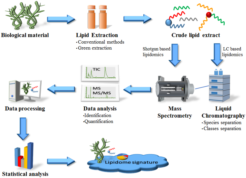 The identification of the total lipid molecular profiles of marine plants has increased in the last several years due to the development of modern technologies, such as MS. In addition, a platform for analysis of the cellular lipidome directly from crude extracts of biological samples is becoming an attractive technique to lipid researchers. This technique allows for direct fingerprinting and quantification of hundreds of individual lipid molecular species in a single target MS or LC-MS analysis [].