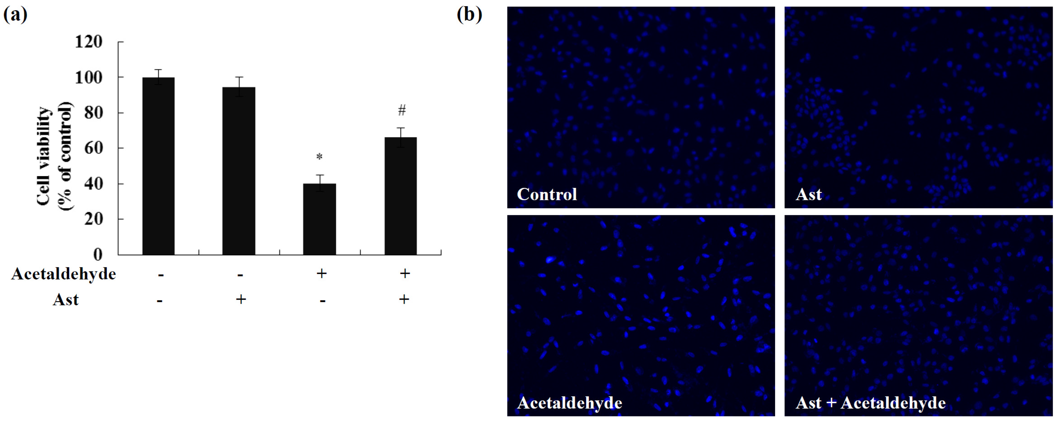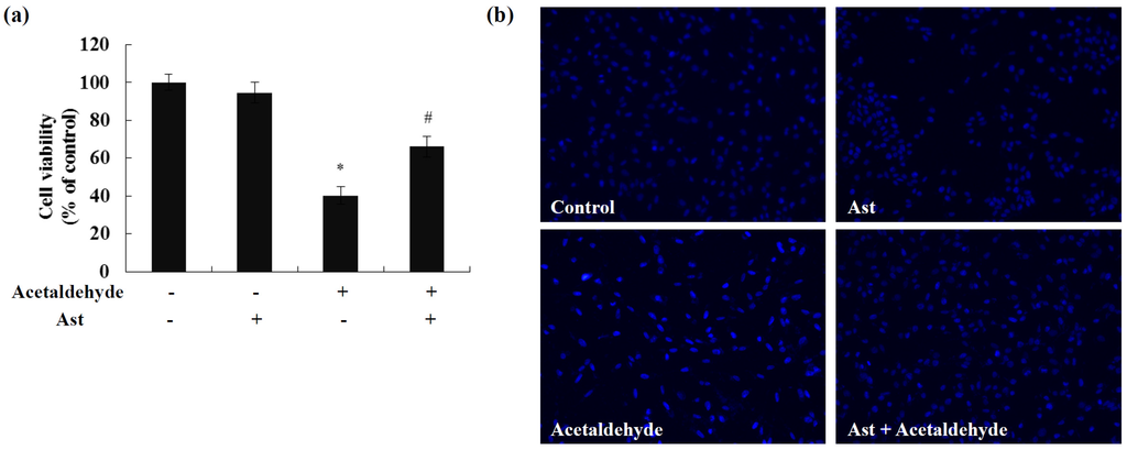 Effects of Ast on acetaldehyde-induced cytotoxicity and apoptois in SH-SY5Y cells. (a) Cells incubated with vehicle or 50 ng/mL Ast for 24 h were incubated with 10 mM acetaldehyde for 24 h. Cell viability was determined by trypan blue assay; (b) Cells were fixed and stained with Hoechst 33258. Values are means ± SD from three independent experiments. * Significantly different from control group (p < 0.05); # significantly different from acetaldehyde-treated group (p < 0.05).