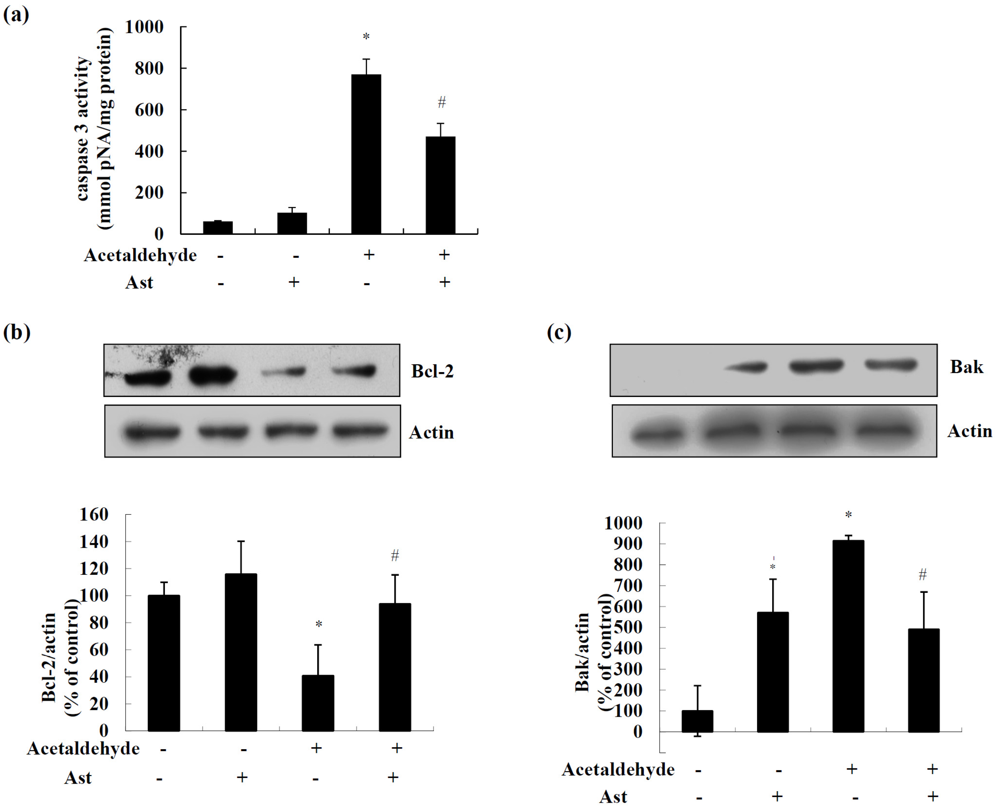 Caspase 3 is a hallmark of the late apoptotic events. As shown in Figure 2a, acetaldehyde significantly increased the activity of caspase 3 by nearly 12.5 folds, while Ast pretreatment inhibited acetaldehyde-induced activity of caspase 3 by nearly 40%. Mitochondria apoptosis pathway is mainly regulated by Bcl-2 family proteins via affecting the permeability of mitochondria membrane [28,29]. Thus, we next examined the effect of Ast on the expression of Bcl-2 family proteins. As shown in Figure 2b, the level of Bcl-2 protein was increased slightly but not significantly by Ast treatment alone. Surprisingly, we also observed that Ast treatment alone caused an increase in the level of Bak protein (Figure 2c). Exposure of SH-SY5Y cells to acetaldehyde for 24 h resulted in a decrease in Bcl-2 protein level by nearly 60%, while Ast pretreatment attenuated the loss of Bcl-2 protein (Figure 2b). Meanwhile, acetaldehyde exposure increased the protein level of Bak to nearly eight folds of the control cells, while Ast pretreatment markedly decreased this acetaldehyde-induced upregulation of Bak by approximately 50% (Figure 2c). These data suggested that AST might inhibit acetaldehyde-induced apoptosis of SH-SY5Y cells by modulating apoptotic signals including the expression of Bcl-2 family proteins and the activation of caspases.